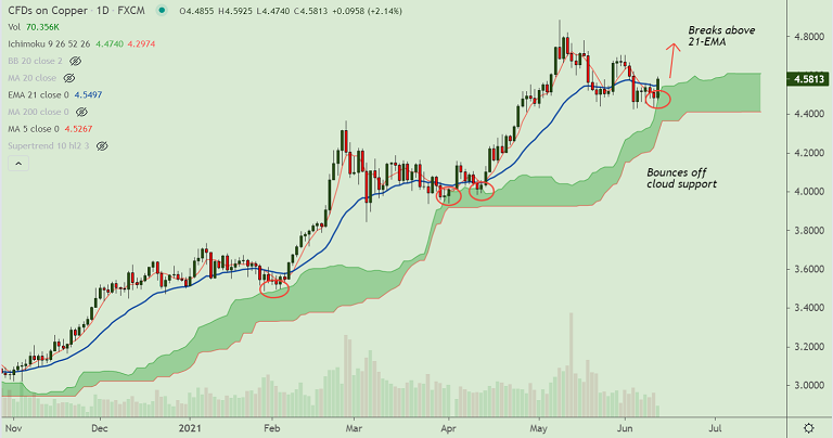 Summary: Copper trades with a major bullish bias. Pullbacks have found strong support at daily cloud. Retrace above 21-EMA have raised scope for upside resumption.