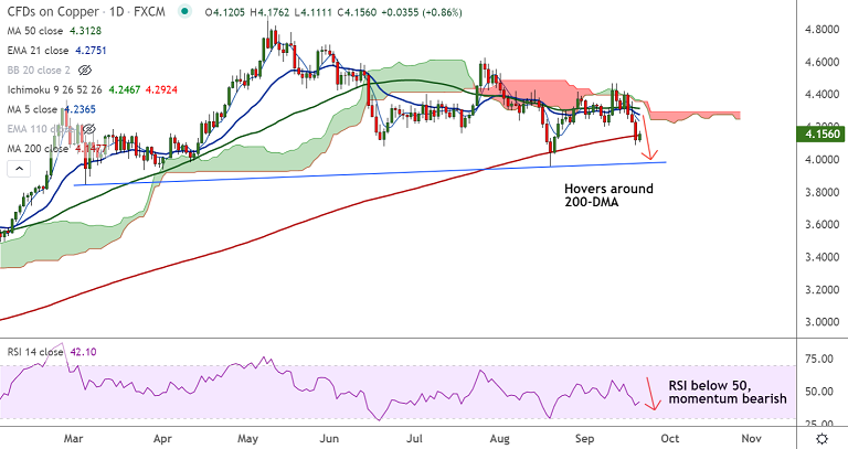 The pair is consolidating break below 200-DMA, scope for dip till trendline support at 3.975. Retrace above 200-DMA negates any further bearishness.
