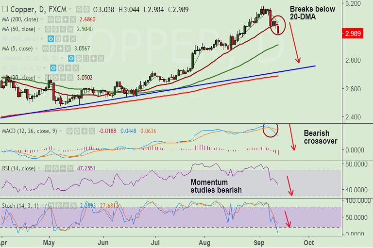- Price action on daily charts has breached 20-DMA support at 3.0502, bias lower.