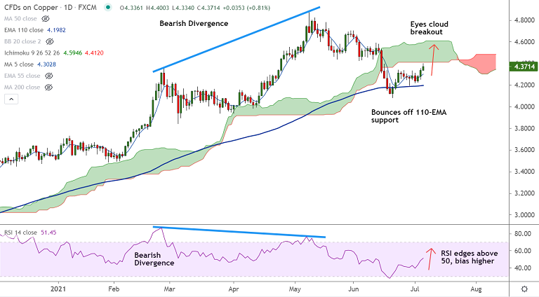 Dollar weakness could boost metal prices. Daily cloud is major hurdle. Bullish bias will be reinforced on cloud breakout.
