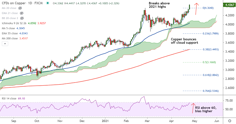 Copper was trading 2.28% higher on the day at 4.4354 at around 17:20 GMT, outlook bullish.