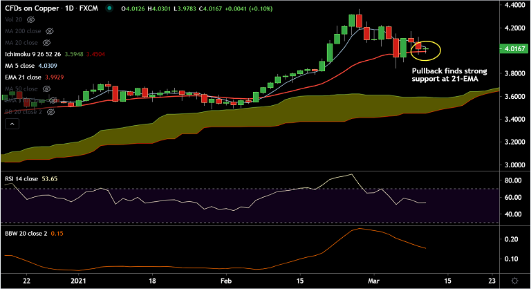 LME copper prices have paused pullback as 21-EMA support, further weakness only on break below.