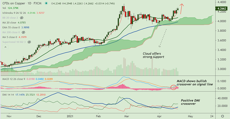 Scope for copper to refresh 2021 highs above 4.364 mark. 5-DMA is immediate support at 4.197. Bullish invalidation only below daily cloud.
