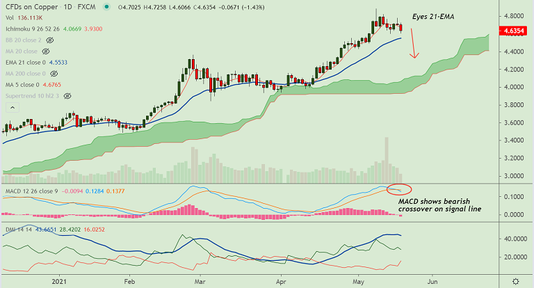 Price action has shown a decisive break below 200H MA, scope for further downside. Copper is on track to test 21-EMA at 4.549.