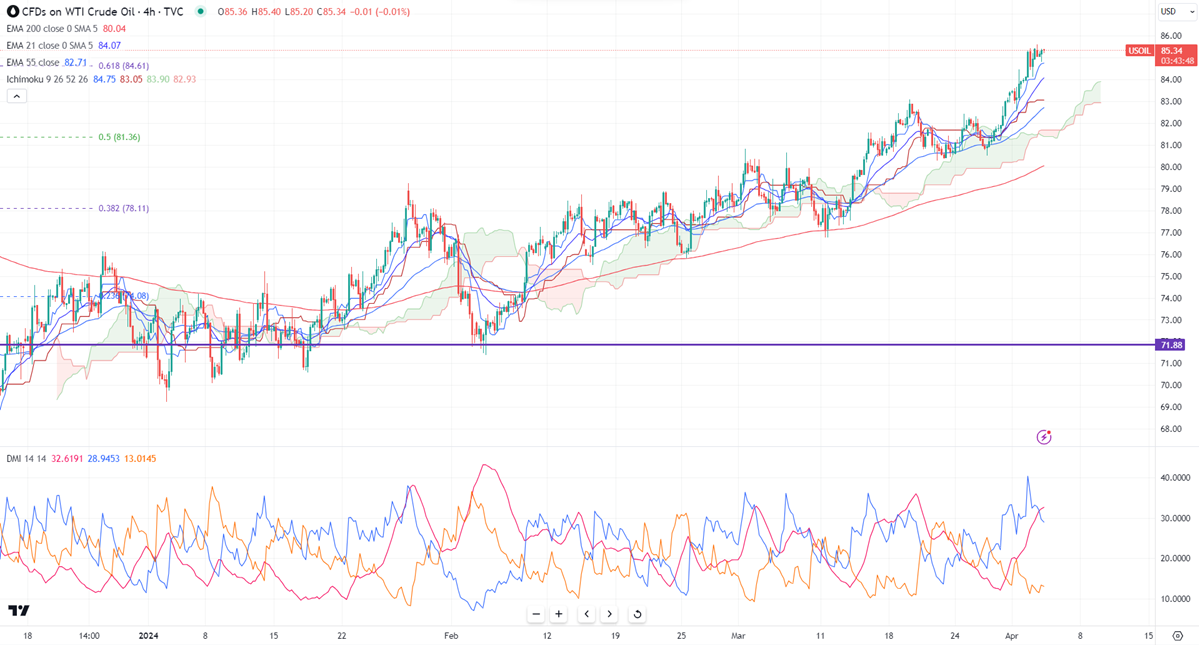 WTI crude oil holds above $85 on geopolitical tensions in the Middle East. It hit a high of $85.42 at the time of writing and is currently trading at $85.35.