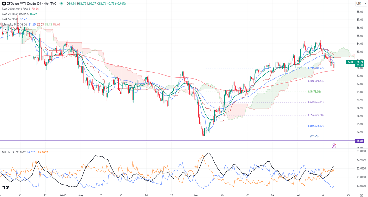 WTI crude oil is declining for a fourth consecutive day on demand concerns. It hit a low of $80.83 at the time of writing and is currently trading at $81.63.