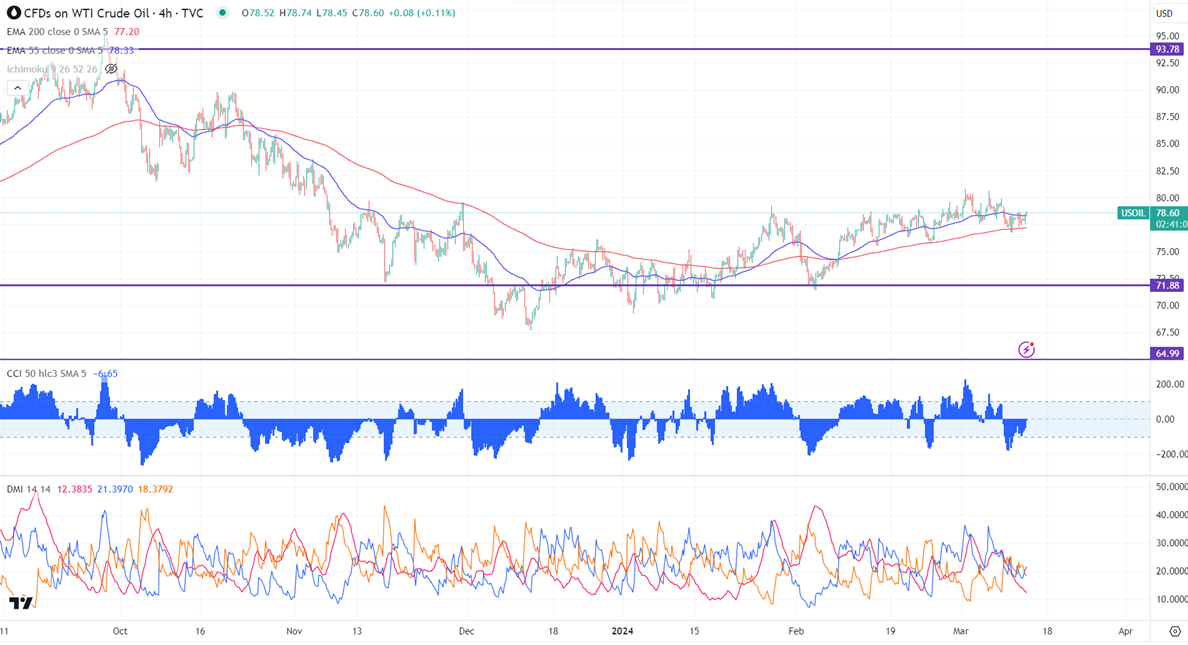 WTI crude oil showed a minor pullback on a strong demand outlook. It hit a high of $78.68 and is currently trading around $78.57.