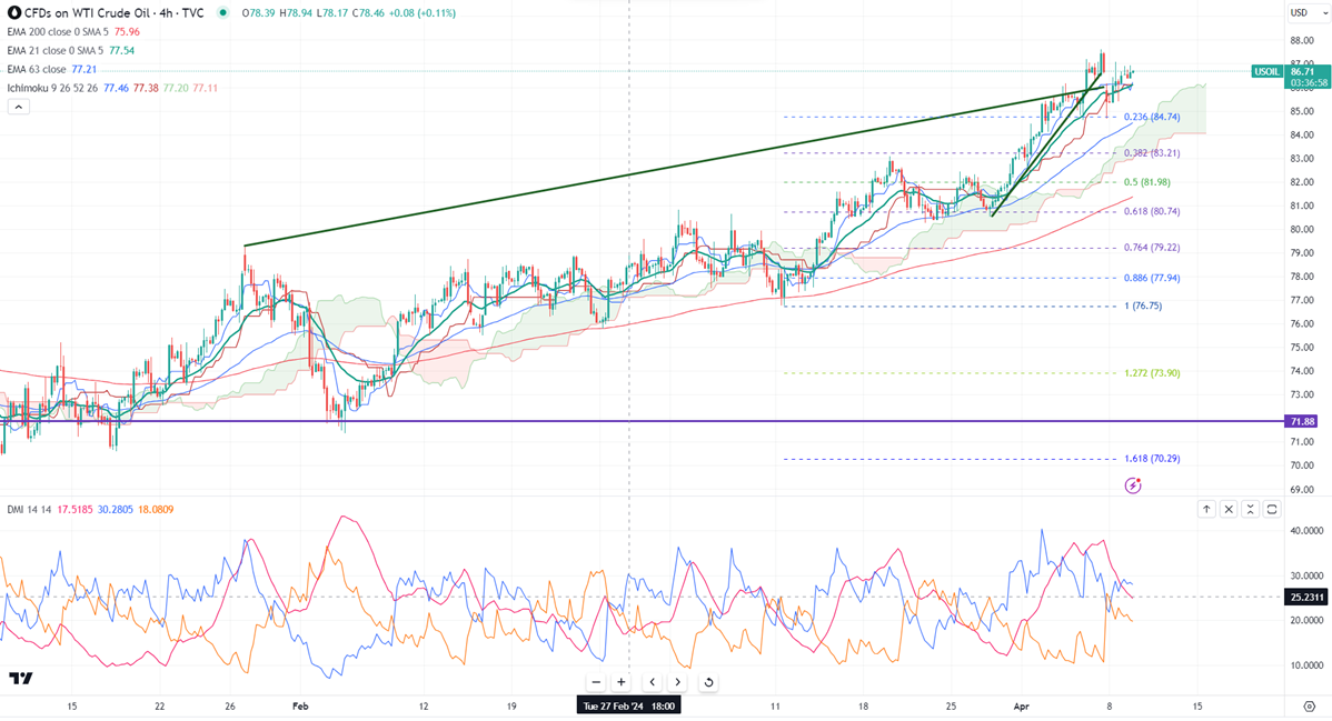WTI crude oil consolidating in a narrow range between $84.61 and $87.59. It hit a high of $86.94 yesterday and is currently trading at $86.62.