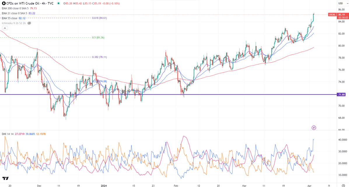 WTI crude oil hits a five-month high on supply concerns. It hit a high of $85.42 at the time of writing and is currently trading at $85.23.