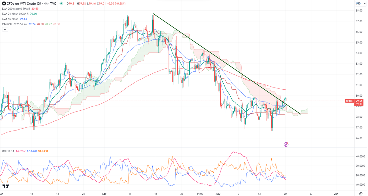 WTI crude oil showed a minor pullback after the PBOC monetary policy. It hit a high of $79.93 at the time of writing and is currently trading at $78.79.