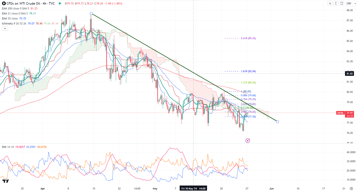 WTI crude oil recovered slightly after strong US economic data. It hit a high of $77.80 yesterday and is currently trading at $77.91.