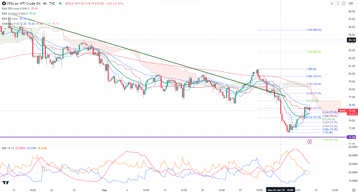 WTI crude oil gained sharply on rate cut hopes.It hit a high of $75.85 yesterday and is currently trading at $75.29.