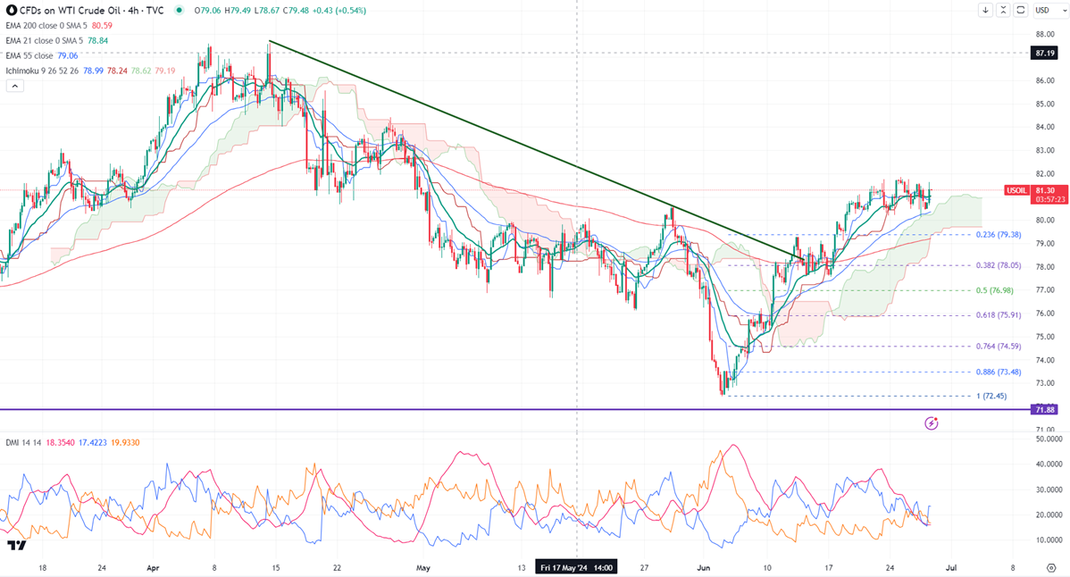 WTI crude oil showed a minor sell-off after weak inventory data. It hit a low of $80.15 yesterday and is currently trading at $81.33.