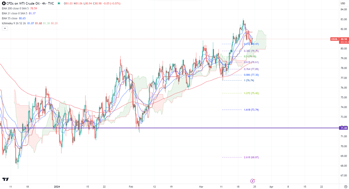 WTI crude oil lost its shine on weak US demand. The jump in the US dollar also puts pressure on oil at higher levels. It hit a low of $80.27 at the time of writing and is currently trading at $80.93.