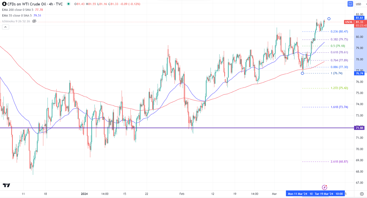 WTI crude oil gained sharply and hit a 3-month high on supply concerns. It hit a high of $81.55 at the time of writing and is currently trading at $81.22.
