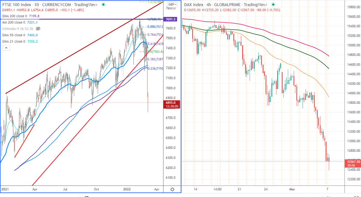 The UK index hits seven months low on global market turmoil. Russia and Ukraine war has affected global market sentiment and decreased demand for riskier assets like stocks. Crude surged above $125 on fears of the US ban on Russian oil imports. FTSE100 declined till 6829 and is currently trading around 6826. Near-term support is at 6750, any breach below targets 6700/6600. The immediate resistance to be watched 7000; violation above will take the index to 7170/7220/7287/7300.