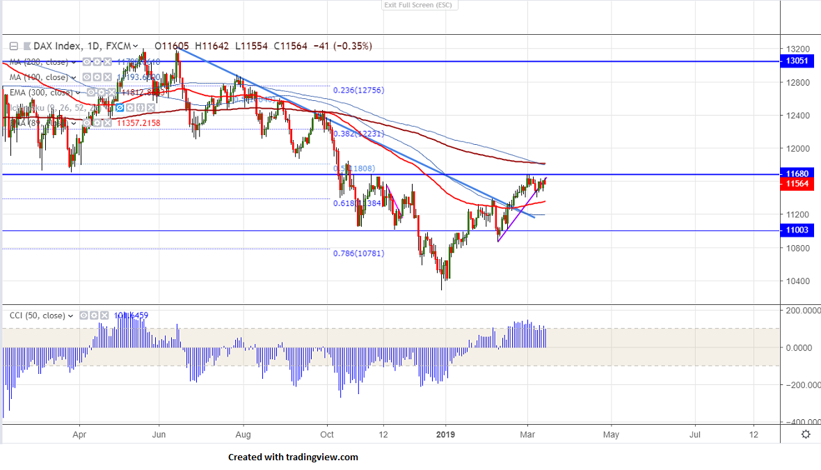 DAX halted its minor weakness after hitting low of 11406. All European markets is trading near 5-month high after UK Parliament rejected no deal Brexit deal and hopes of delay in Brexit is supporting markets. A new vote will take place later Thursday on a postponement to the current Mar 29th deadline. It hits intraday high of 11642 and is currently trading around 11595.