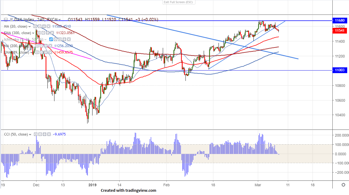 DAX trades slightly lower following footsteps of Wall Street and hits high of 11678 on Mar 3rd 2019. DAX was one of the best performer in past two month and jumped more than 13%. It is currently trading around 11532.