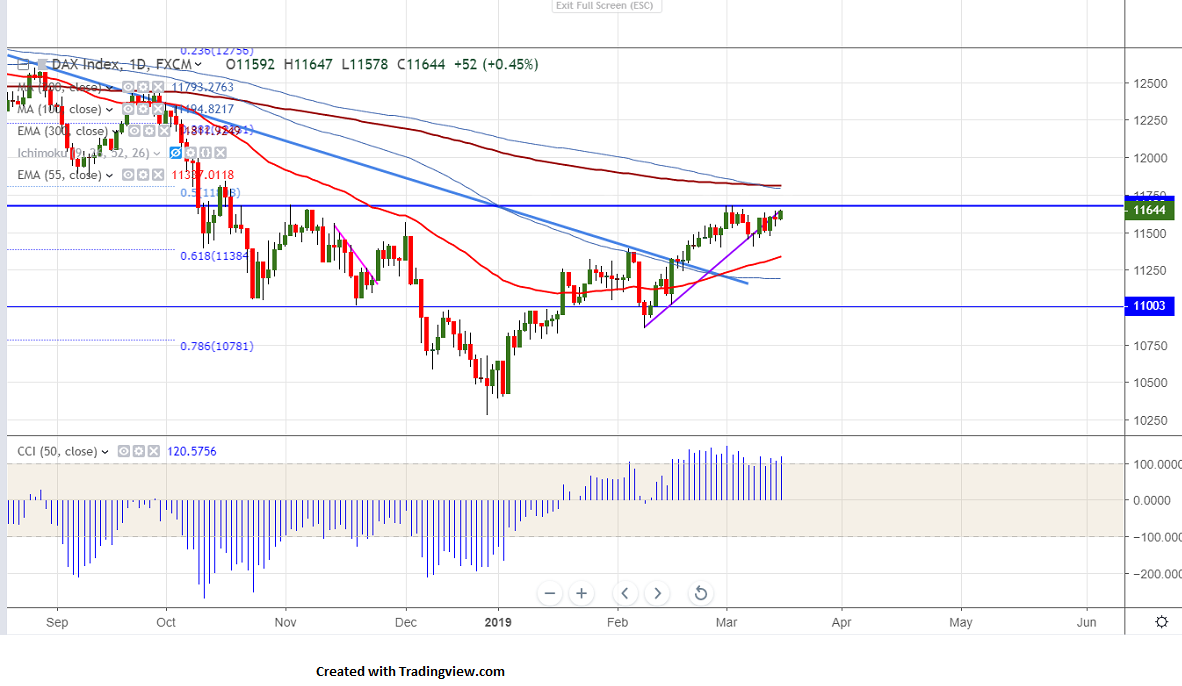DAX is trading flat with positive bias on account increasing risk appetite on positive Brexit news.UK Parliament yesterday voted for extension of Article 50 deadline at the EU summit and won with absolute majority of 412.All European markets is trading near 5-month high on easing political uncertainty . It hits intraday high of 11642 and is currently trading around 11635.