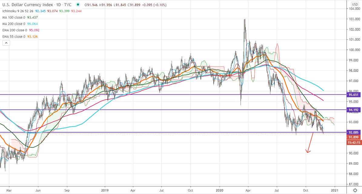 US Dollar index continues to trade lower for the past two weeks and lost more than 3% from a high of 94.74. The COVID -19 vaccine optimism and US stimulus hopes are putting pressure on the US dollar. US durable goods order beats estimates of 0.5% while jobless claims surged to 778K vs forecast of 732K. The flash Q3 GDP came at 33.1% in line with expectations. It hits an intraday low of 91.84 and is currently trading around 91.915.