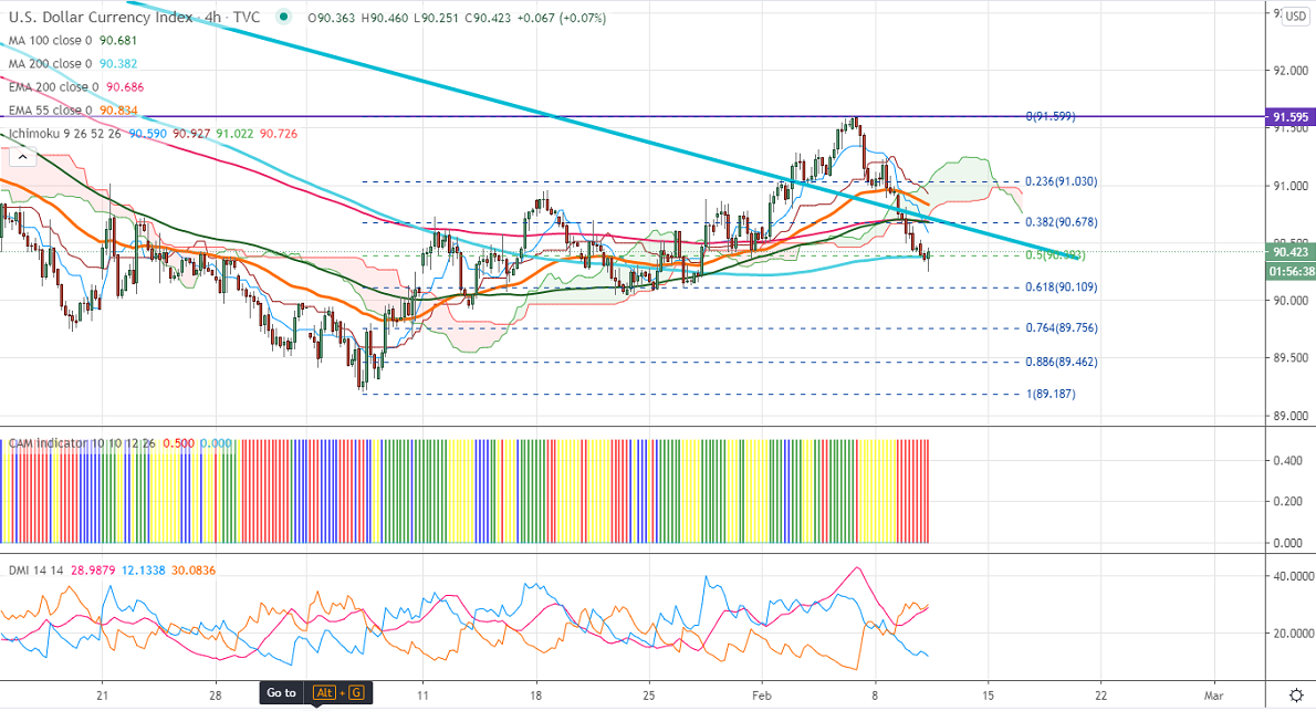 US Dollar index is trading weak after forming a minor top around 91.60. The coronavirus vaccine progress and optimism over huge fiscal stimulus have decreased demand for safe-haven assets like the US dollar. Markets eye US CPI, Fed Powell speech today for further direction. The index has shown a minor decline below 200-4H MA (90.38) and is currently trading around 90.403.