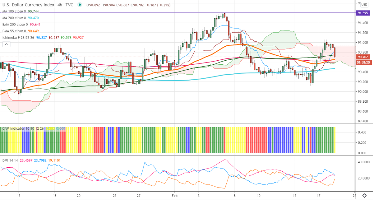US Dollar index has declined sharply after a minor jump above 91 levels. The index surged more than 1% in the past two days on rising US bond yield. The US 10- year yield hits a multi-year high on hopes of more stimuli from the U.S. The US retails sales rose 5.3% in Jan m/m, the highest jump in the seventh months. Markets eye US initial jobless claims and Philly fed manufacturing data for further direction. The index hits an intraday high of 90.67 and is currently trading around 90.620.