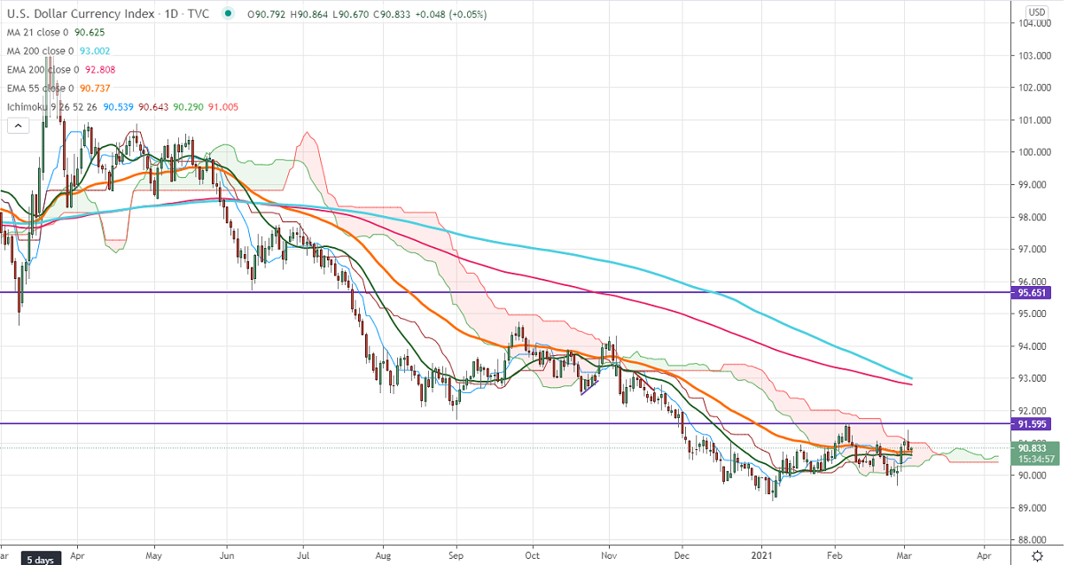 US Dollar index has once again after hitting a high of 91.39. The surge in US bond yield was supporting the US dollar at lower levels. The bond yield surged more than 350% in the past 11 months on stimulus from US Fed. Markets eye US ADP employment data and ISM services for further direction. The index hits an intraday low of 90.67 and is currently trading around 90.81.