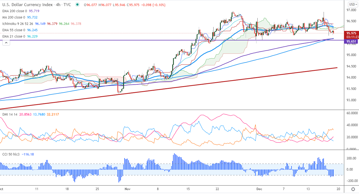 US Dollar index is trading weak for third consecutive days despite hawkish US Fed. The central bank has doubled the taper of bond buying, expected to raise rates three times in 2022. DXY hit a high of 96.90 after Fed monetary policy. The decline in US treasury yields is dragging the US dollar down below 96 levels. It hits an intraday low of 95.85 and is currently trading around 95.949.