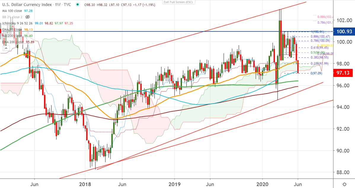 US Dollar index continues to trade weak for 3rd consecutive week and lost more than 300 pips till 97.10. The decline was mainly due to broad-based US dollar selling. The number of people filed for unemployment benefits rose to 1.87 million last week, slightly worse than the forecast of 1.80 million.