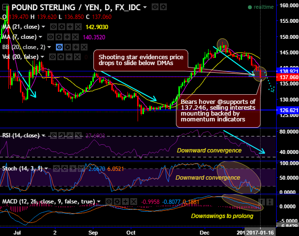 The shooting star that was traced at peaks of 146.707 levels evidences price drops to slide below DMAs and have broken supports of 138.921 and 137.246 levels on southwards.
