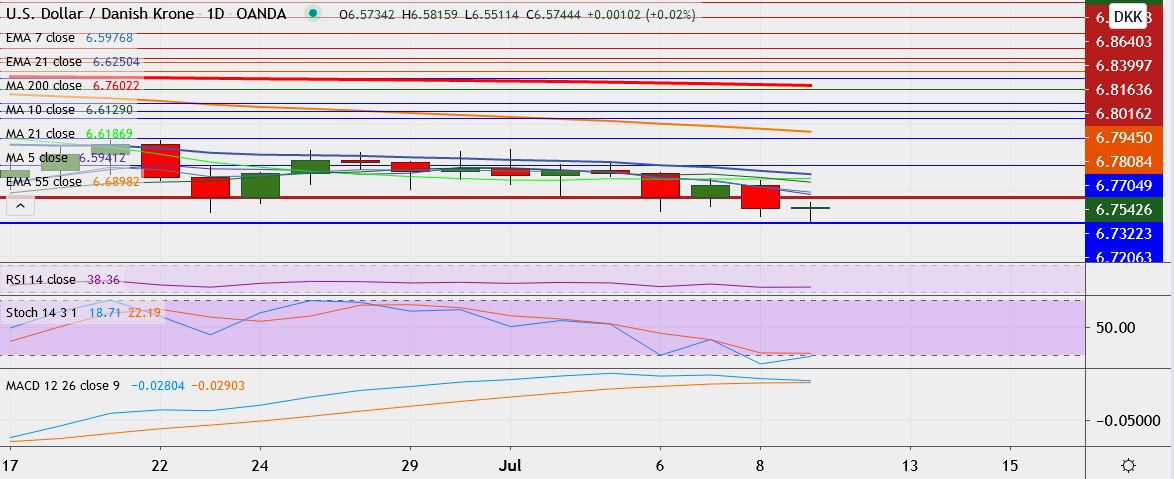 - USD/DKK is trading 0.05 down at 6.5770, having hit low of 6.5511 earlier, its lowest since June 11.