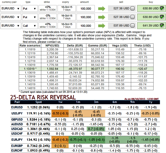 The spot FX EURUSD is ticking up at 1.1344 with negative delta risk reversal has been gradually picking up after 3 months which means fed's rate policy expectation that is scheduled in December cannot be disregarded, an investor may want to protect his asset from downside price risks on euro side. So, he considers buying a EURUSD put assuming scenario that dollar's strength owing to rate hike.