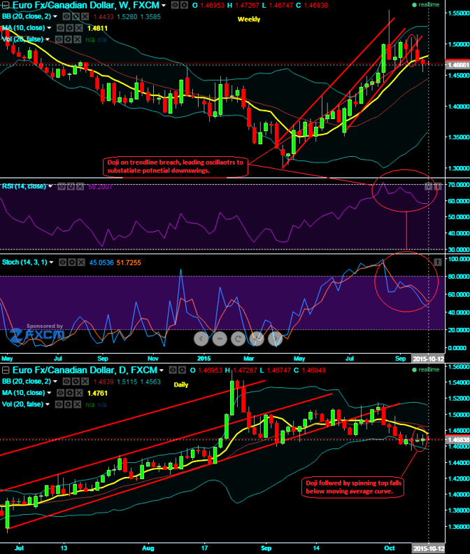 On both weekly and daily charts of EURCAD we spot out Doji pattern candles formed to highlight a caution for bulls. As you can observe Doji on weekly charts has occurred exactly on a trendline breach at around 1.4909 levels which is to be considered as a caution of previous of upswings. On daily chart, again a sharp Doji is formed at 1.4674 levels followed by a spinning top candle has formed to fall below moving average curve.