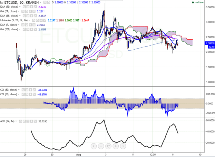 ETC/USD jumped till 200 HMA and declined from that level. It is currently trading around $2.30 (Kraken).