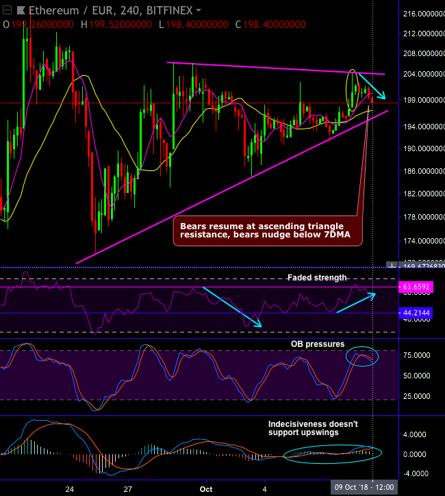 Technically, ETHEUR bears resume exactly at ascending triangle resistance at 206.0688 levels. Consequently, bears nudge below 7DMAs (refer 4H charts). Both leading oscillators (RSI & stochastic curves) signal overbought pressures and lagging indicators have been indecisive.