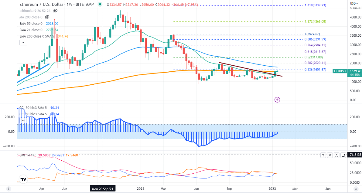 The immediate resistance stands at around $1620. Any breach above confirms a minor pullback. A jump to $1676/$1809/$2000 is possible. A surge past $2500 will take Ethereum to Apr monthly high of $3581.