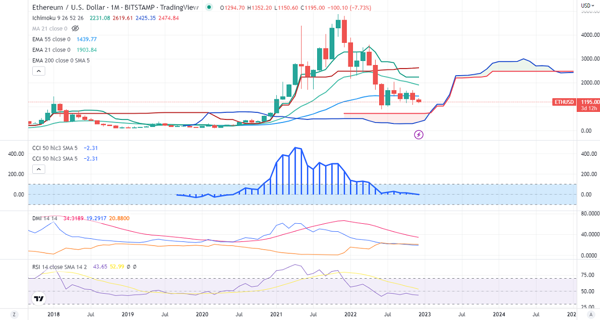 ETHUSD was one of the worst performers this year and lost more than $2500 on board-based crypto selling. A hawkish rate hike was a major reason for the decline of riskier assets like BTC. The collapse of FTX has dragged Ethereum further down. It hits a low of $880 on June 18th, 2022, and currently trading around $1196.10.