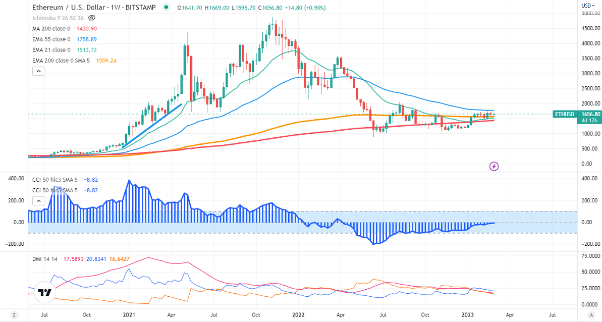 Major support - $1550. Any violation below this level confirms major weakness. A dip till $1460/$1400.The pair holds above the short-term weekly moving average (21-W EMA ) and below 55 EMA. Any close above $1770 confirms further bullishness, a jump to $2000.