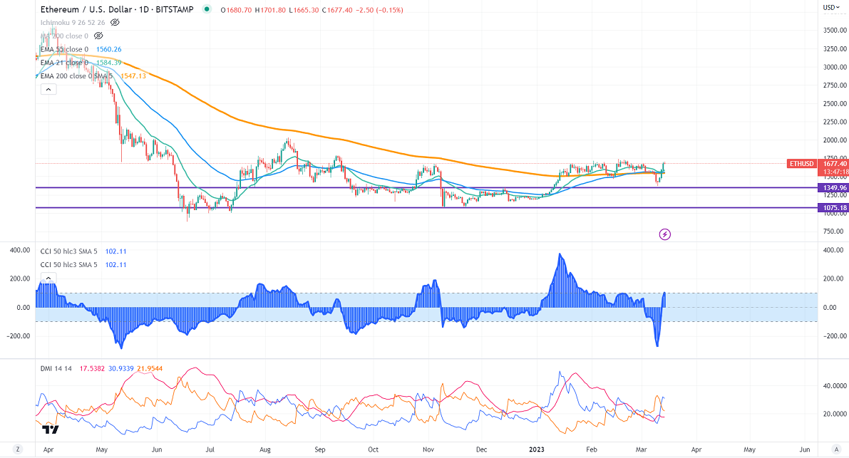 ETHUSD retest its significant resistance of $1350-55 and showed a nice pullback following the footsteps of BTC. The crypto market showed momentum after weak US Non-farm payroll data. It has decreased the chance of further rate hikes by the Fed. Markets eye US CPI numbers for further movement. Headline inflation is anticipated to rise by 0.40% m/m from 0.50% the previous month. The yearly CPI is expected to drop to 6% vs . 6.40% the previous month. It hits a high of $1701.80 and is currently trading around $1676.10.