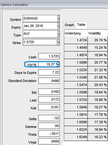 EURAUD spot FX is currently trading at 1.5665, from here onwards our 2 lots of 15D longs on ITM strike vega puts would start maximizing profits utilizing higher implied volatilities considering the current short term downtrend.