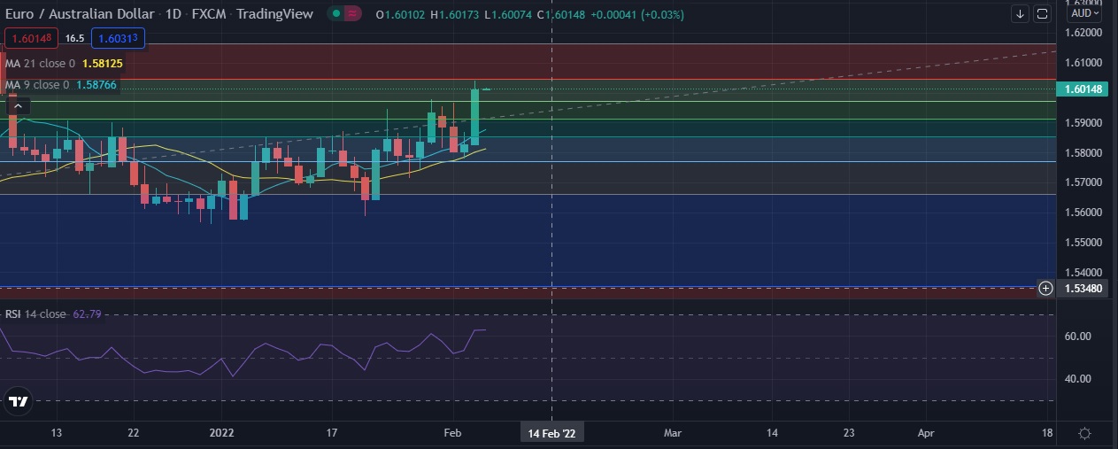 • EUR/AUD bulls confidence is running high, a rise towards 1.6150 is likely.