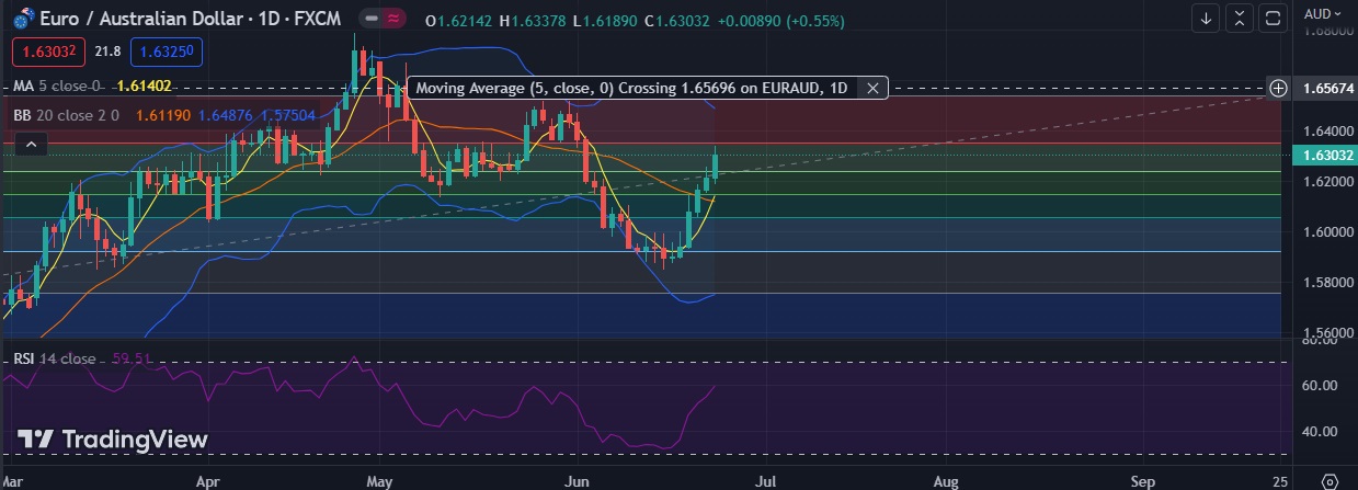 • EUR/AUD strengthened on Friday as broad Australian dollar weakness helped the gain above 1.6300.