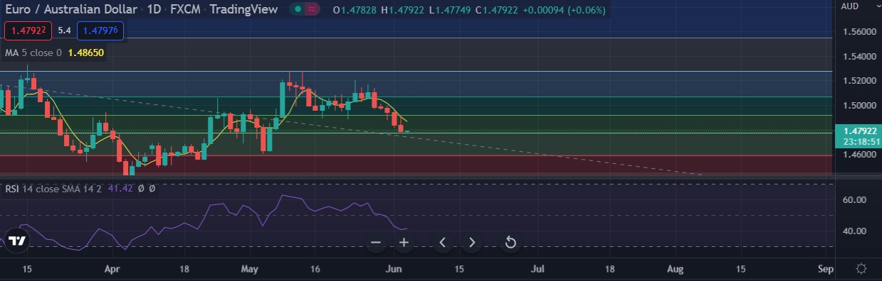 • EUR/AUD is now on course to register a close below the 1.4773 (38.2%fib ) level, chart points to bigger drop towards 1.4630.