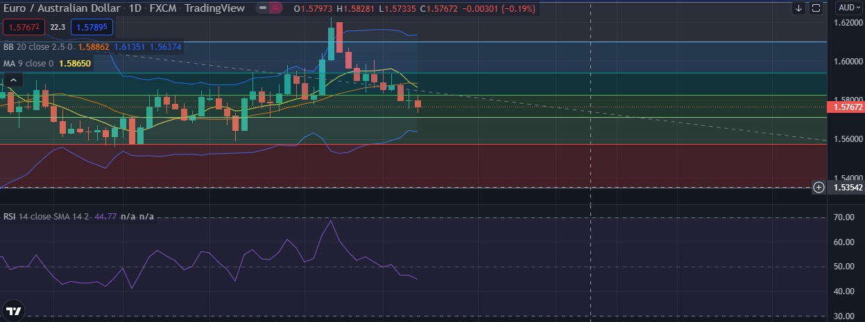 • Strong support is seen at 1.5710 (38.2%fib) and break below could take the pair towards 1.5644(Lower BB).