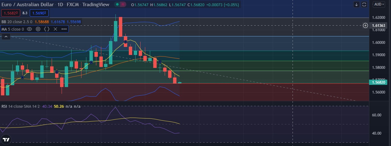 • Strong support is seen at 1.5669 (23.6%fib) and break below could take the pair towards 1.5572 (Lower BB).