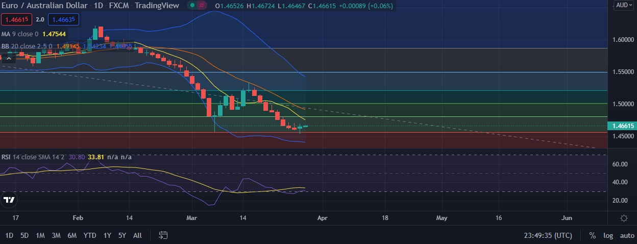• Strong support is seen at 1.4572 (23.6% fib) and break below could take the pair towards 1.4418 (Lower BB).