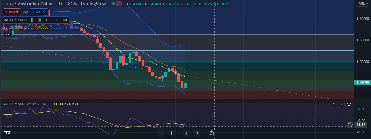 • The pair is currently approaching resistance at 1.4578 (38.2% fib). Resistance at 1.4578 is likely to cap further upside in the pair.