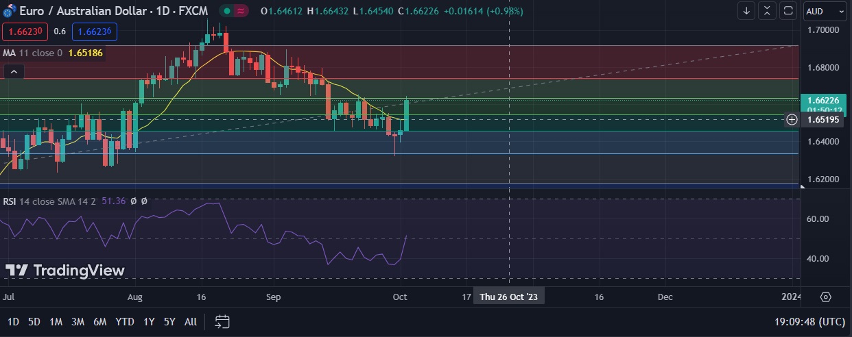 • EUR/AUD strengthened on Tuesday as the pair rebounded from one month low after RBA held interest rates steady for a fourth month and showed no urgency to hike again.