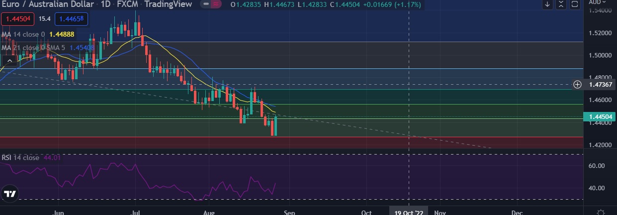 • EUR/AUD spiked up to 1.4450 on after U.S. data indicated inflation moderated further and a Reuters ECB sources story said policymakers want to discuss a 75bp hike in September.