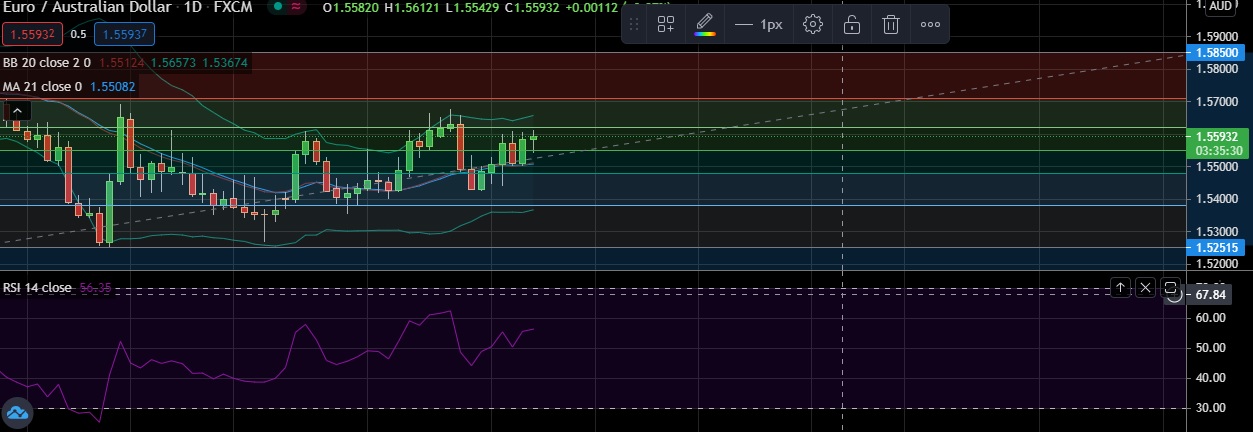 • EUR/AUD bulls confidence is running high, a test of the 1.5654 (Higher BB) highly seems likely.